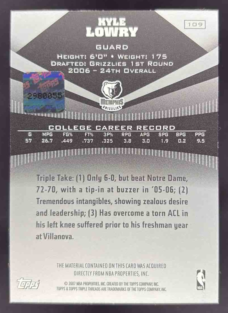 2006-07 Topps Triple Threads #109 Kyle Lowry RC Auto /99