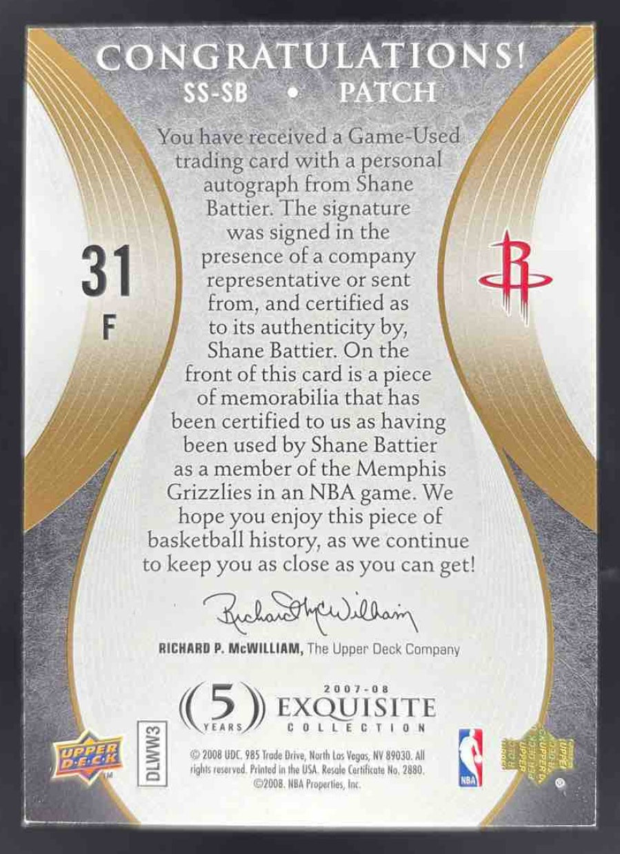 2007-08 Exquisite Collection Scripted Swatches Shane Battier Autograph Auto /15