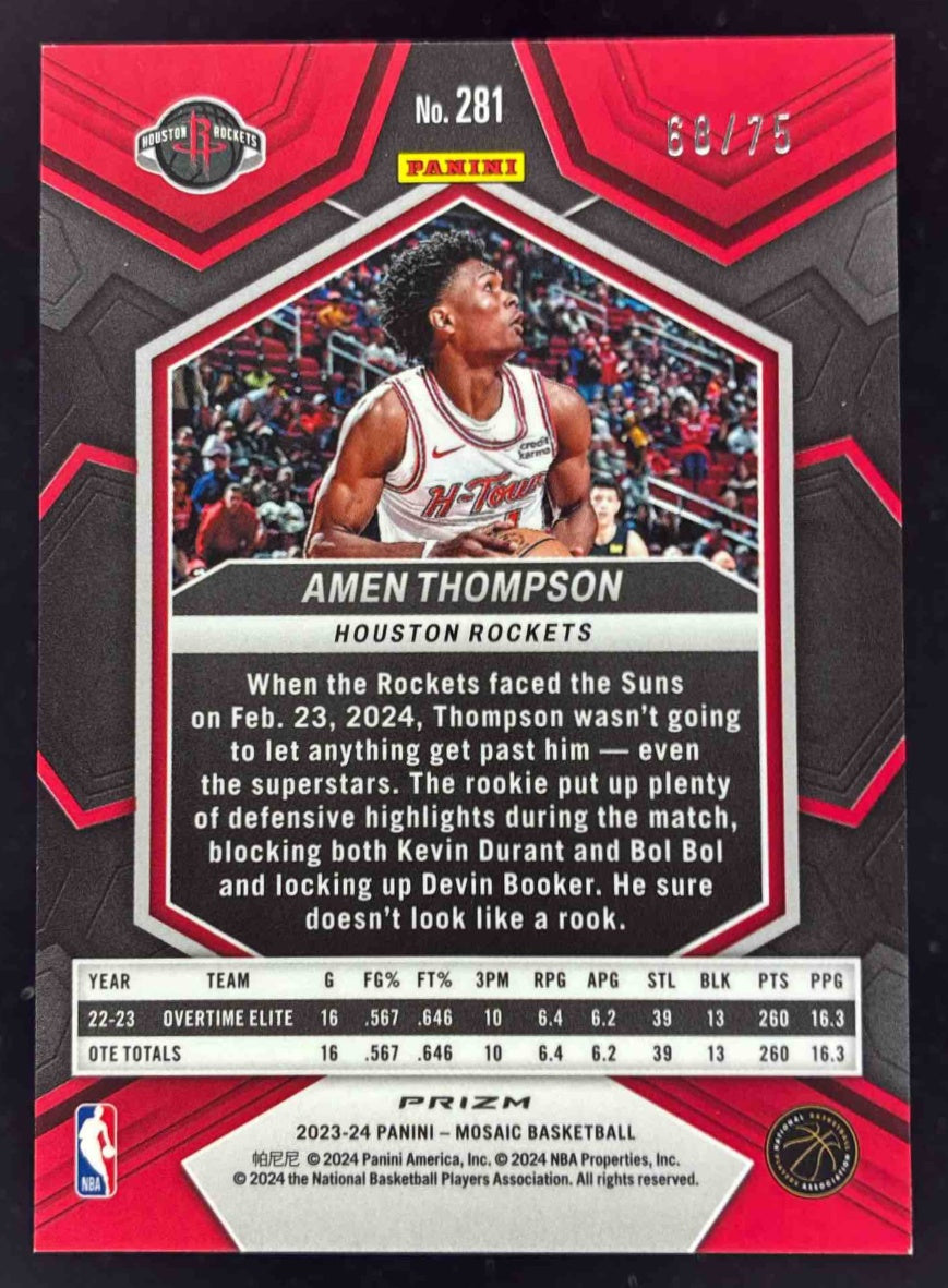 2023-24 Panini Mosaic Choice Fusion Red & Yellow #281 Amen Thompson RC /75