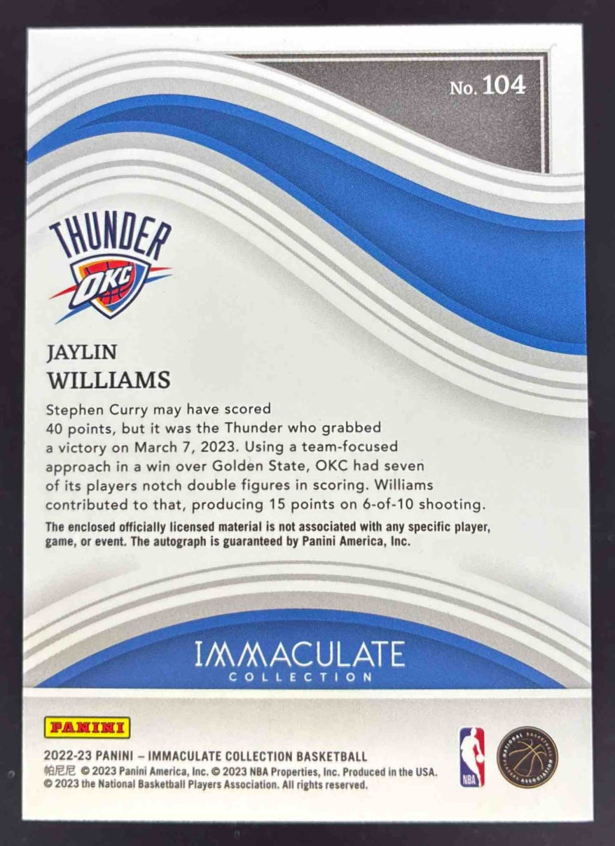 2022-23 Panini Immaculate Collection #104 Jaylin Williams Autograph RC Auto /99