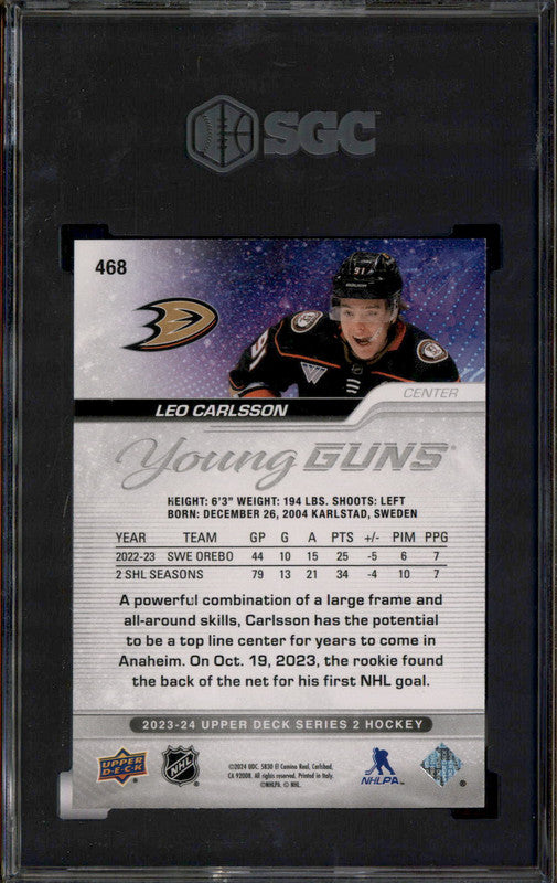 2023-24 Upper Deck #468 Leo Carlsson Young Guns RC Rookie SGC 9.5