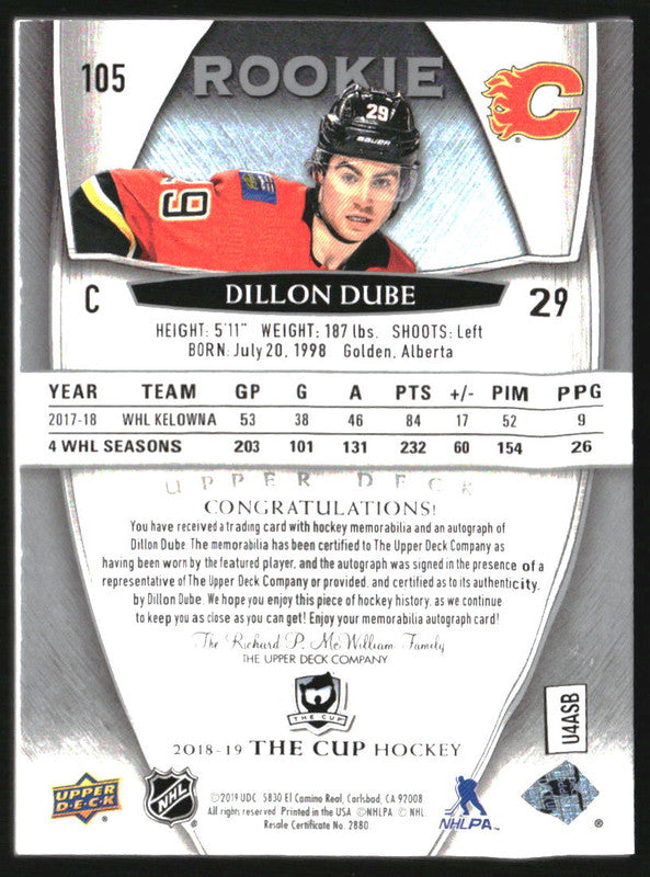 2018-19 The Cup #105 Dillon Dube Rookie Jersey Autograph RC Auto /249