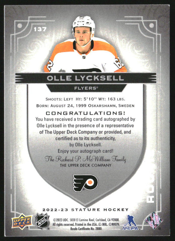 2022-23 Upper Deck Stature Photo Variant Autographs Olle Lycksell RC Auto /49