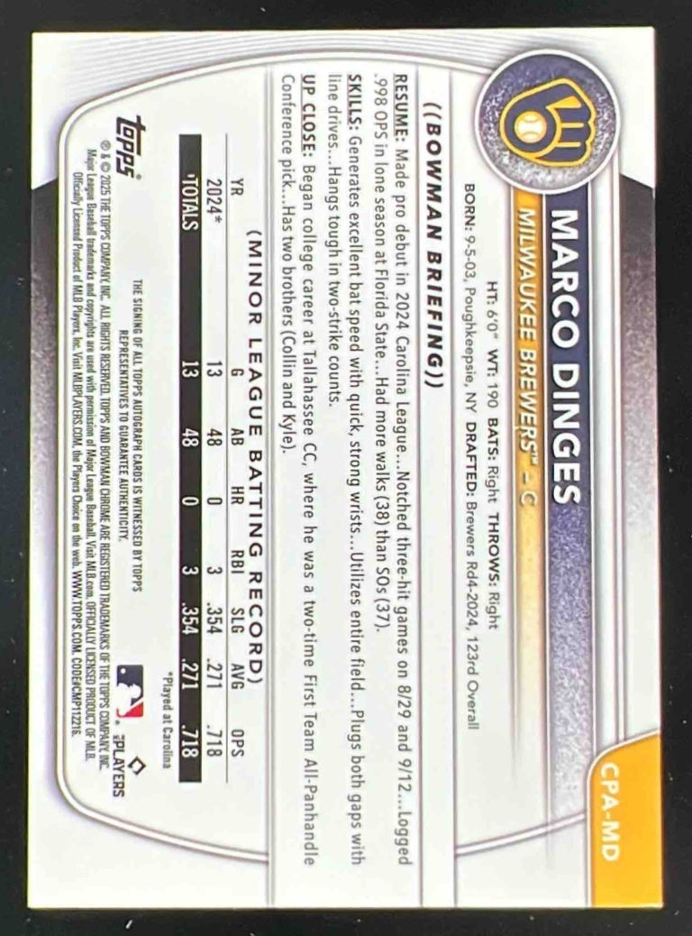 2025 Bowman Chrome Blue RayWave Refractor #CPA-MD Marco Dinges RC Auto /150