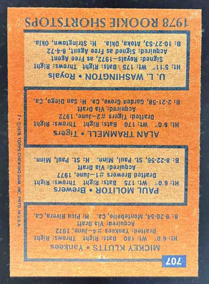 1978 Topps #707 Mickey Klutts Paul Molitor Alan Trammell U.L. Washington RC