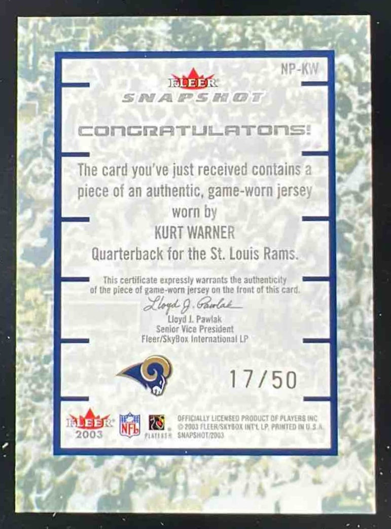 2003 Fleer Snapshot Projections Jerseys Gold #NP-KW Kurt Warner /50