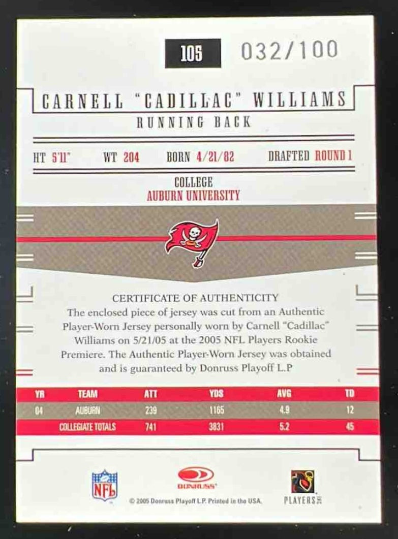 2005 Donruss Gridiron Gear Jerseys Numbers Carnell Cadillac Williams RC /100