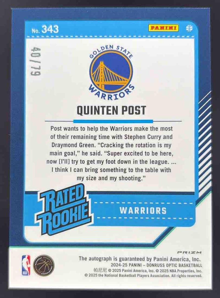 2024-25 Donruss Optic Rated Rookies Pink Velocity #343 Quinten Post RC Auto /79