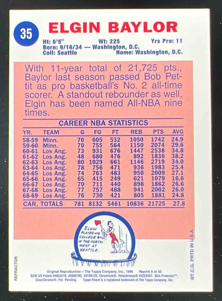 1996-97 Topps Stadium Club Finest Reprints Refractor #6 Elgin Baylor