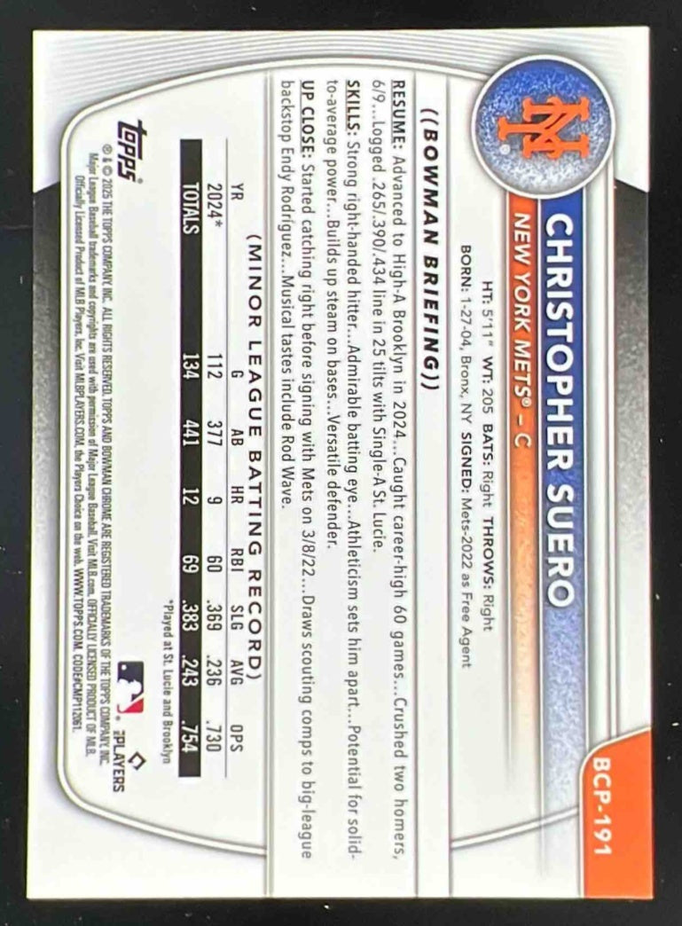 2025 Bowman Chrome Prospects Red Wave Refractor #BCP-191 Christopher Suero RC /5
