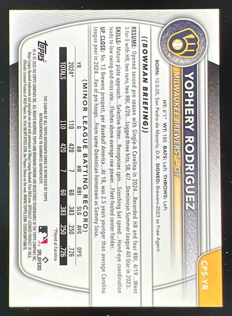 2025 Bowman Sapphire Chrome Autographs #CPS-YR Yophery Rodriguez RC Auto /199