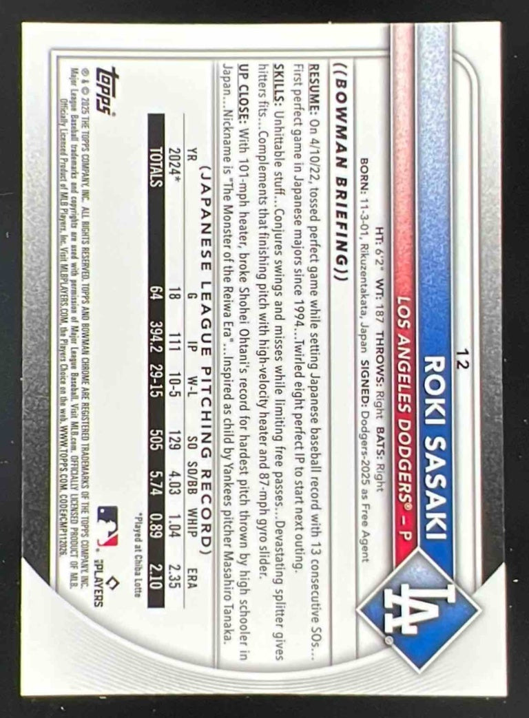 2025 Bowman Chrome Wave Refractor #12 Roki Sasaki RC /100