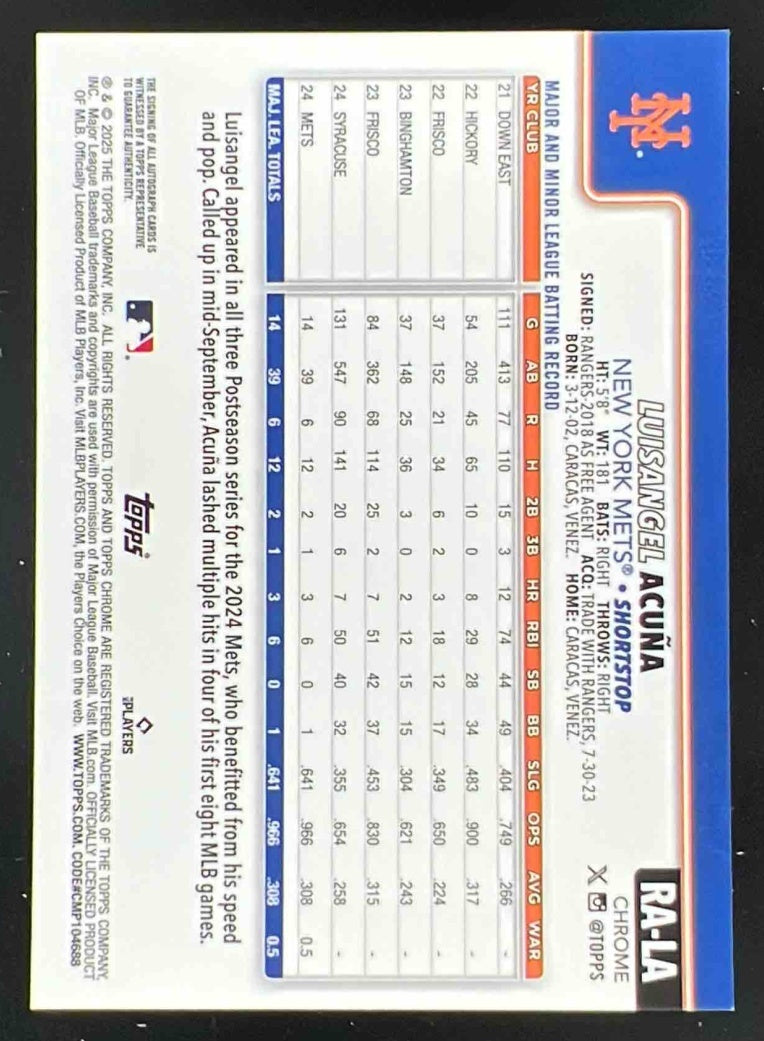 2025 Topps Chrome Rookie Autographs #RA-LA Luisangel Acuna RC Auto