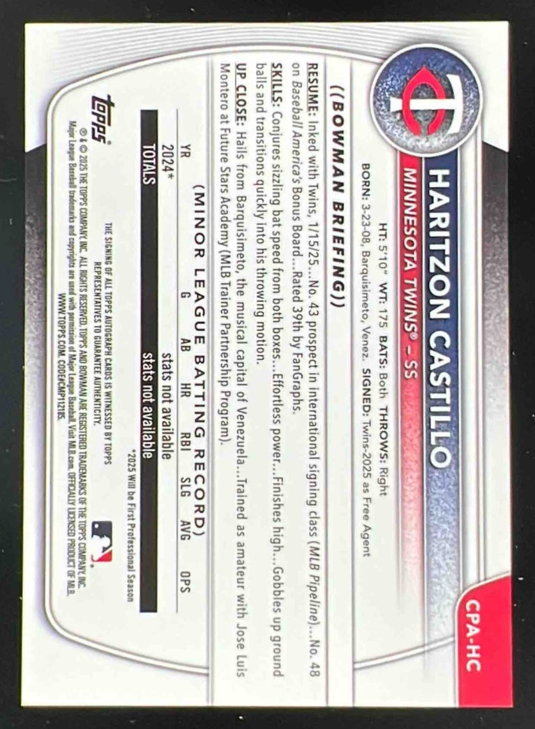 2025 Bowman Chrome Speckle Refractor #CPA-HC Haritzon Castillo RC Auto /299