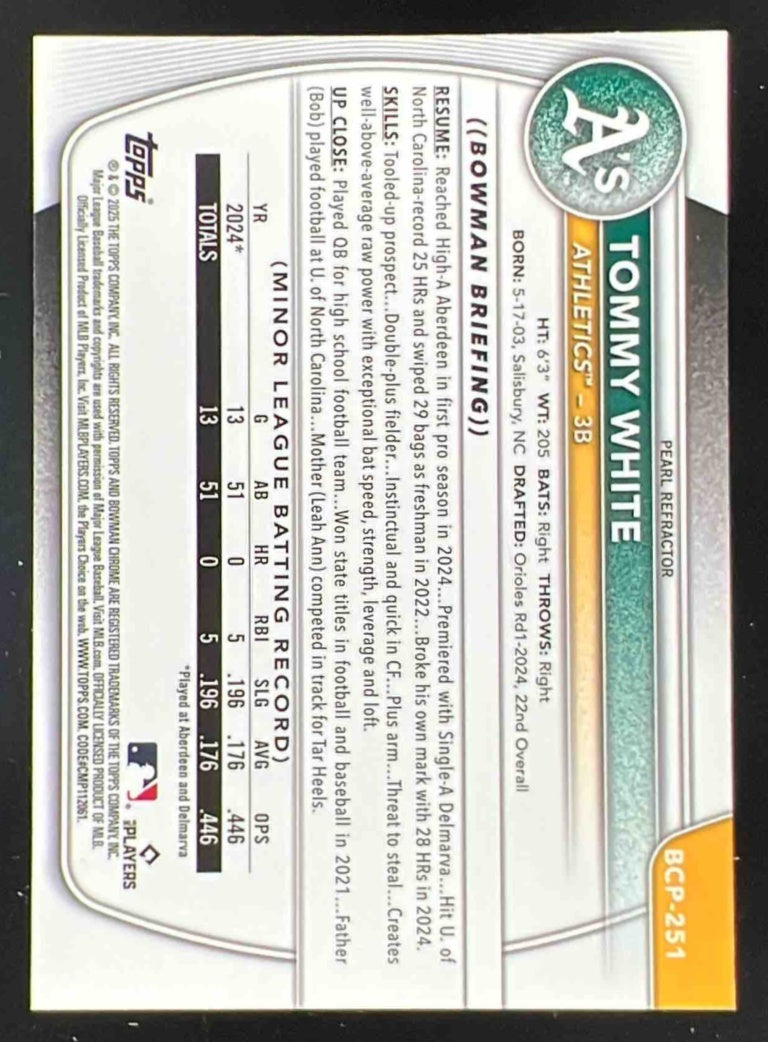2025 Bowman Chrome Prospects Pearl Refractor #BCP-251 Tommy White RC