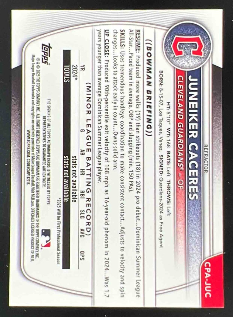 2025 Bowman Chrome Autograph Refractor #CPA-JUC Juneiker Caceres RC Auto /499