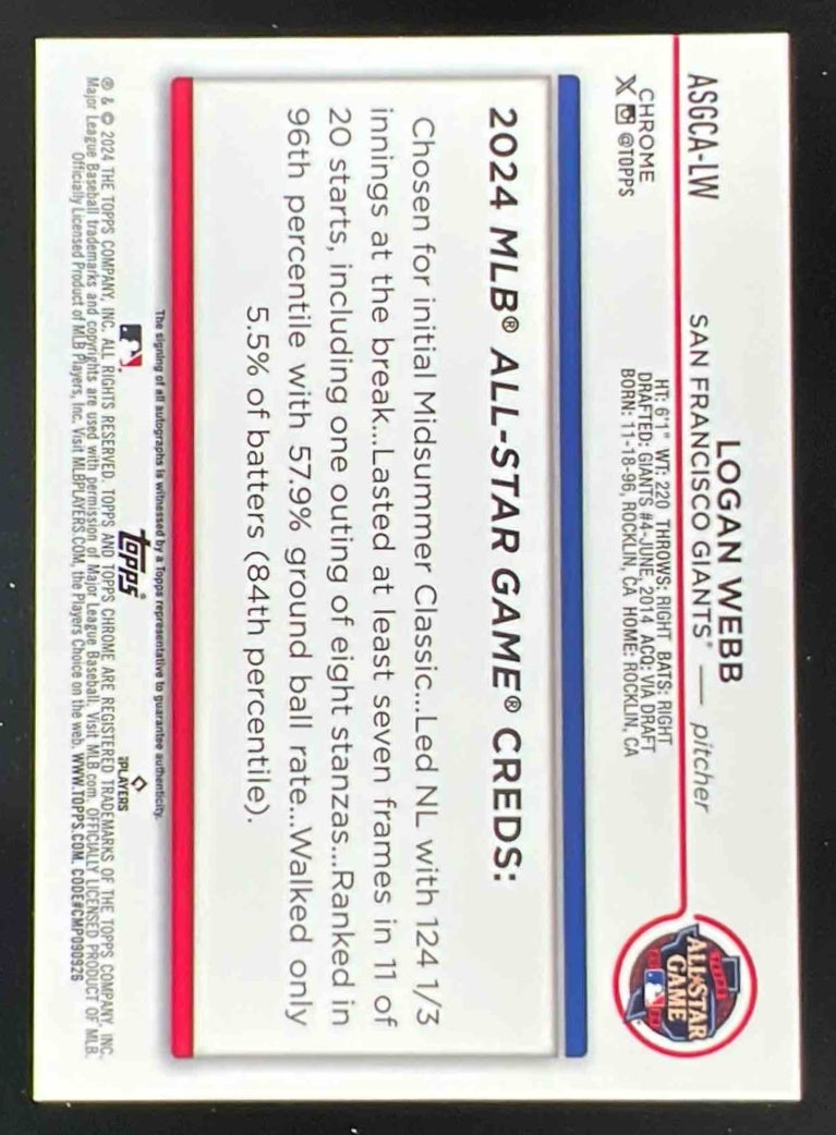 2024 Topps Chrome Update 2024 All-Star Game Autographs #ASGCA-LW Logan Webb Auto