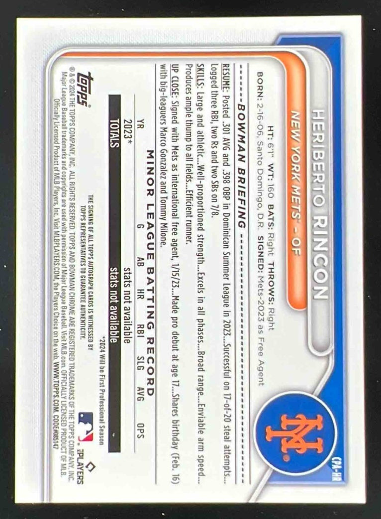 2024 Bowman Chrome Yellow Refractor #CPA-HR Heriberto Rincon RC Auto /75