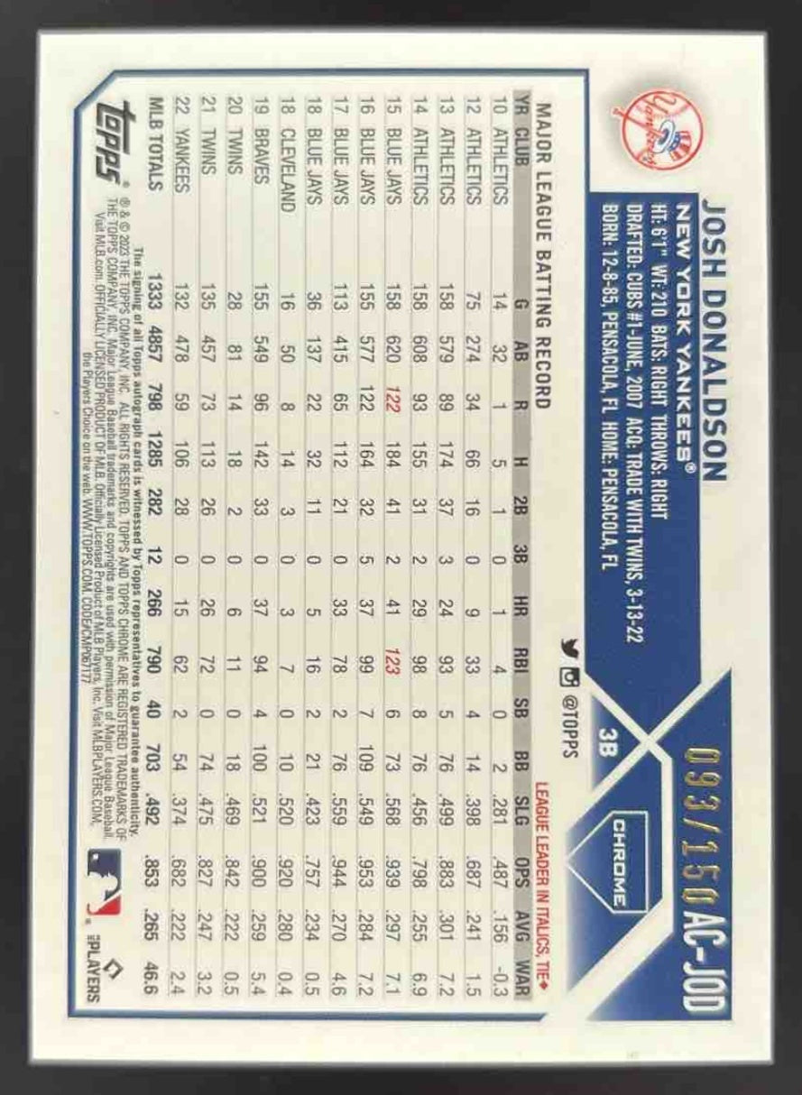 2023 Topps Chrome Autographs Blue Refractor #AC-JOD Josh Donaldson Auto /150