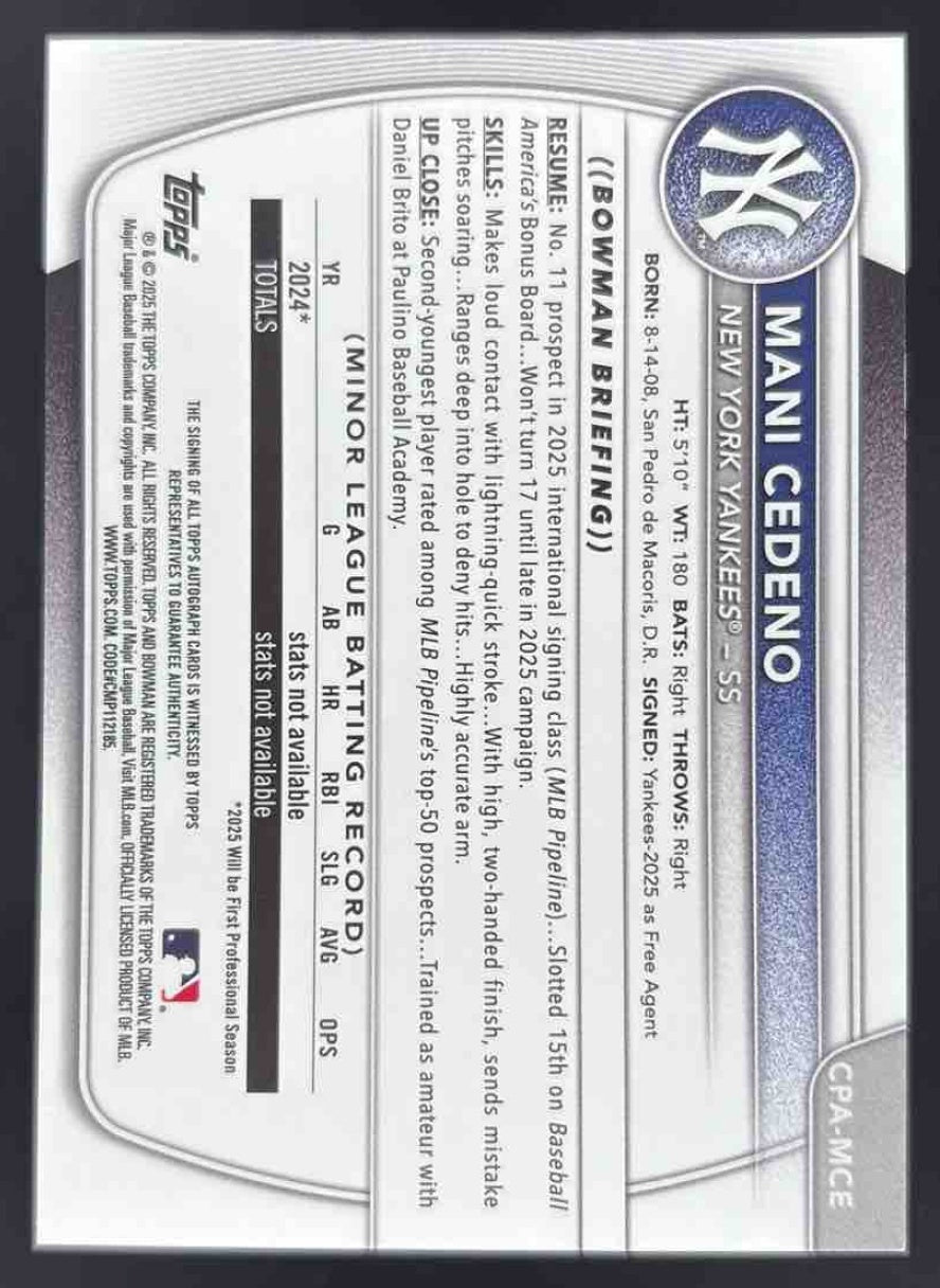 2025 Bowman Chrome Autograph Purple Refractor #CPA-MCE Mani Cedeno RC Auto /250