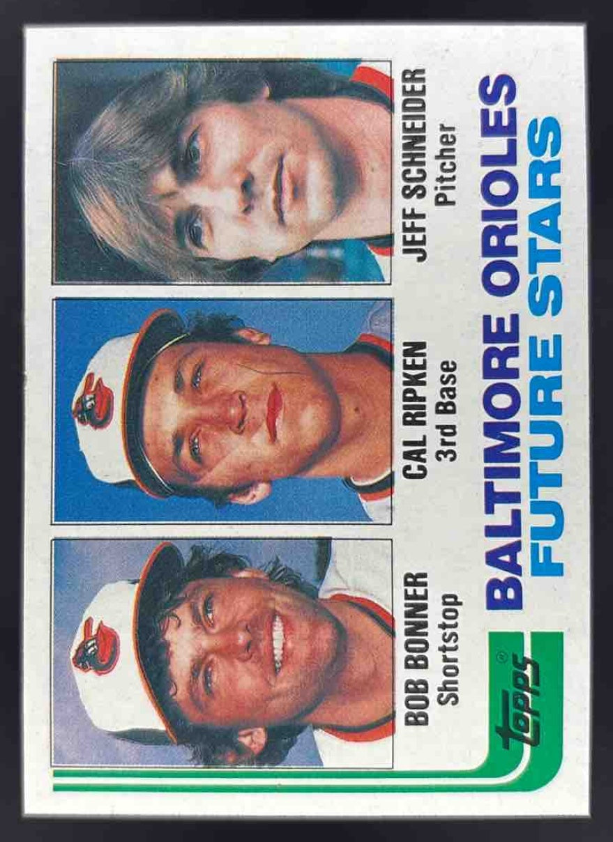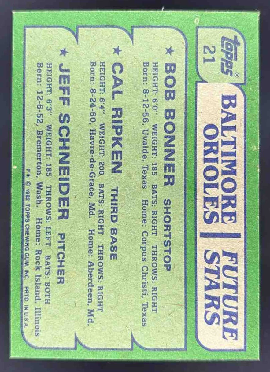 1982 Topps #21 Orioles Future Stars Bob Bonner Cal Ripken Jeff Schneider RC