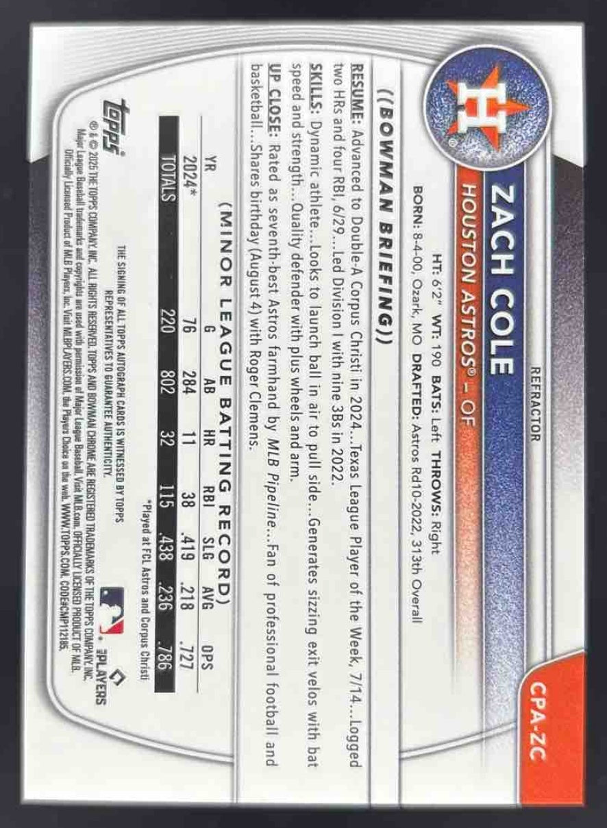 2025 Bowman Chrome Autograph Refractor #CPA-ZC Zach Cole RC Auto /499