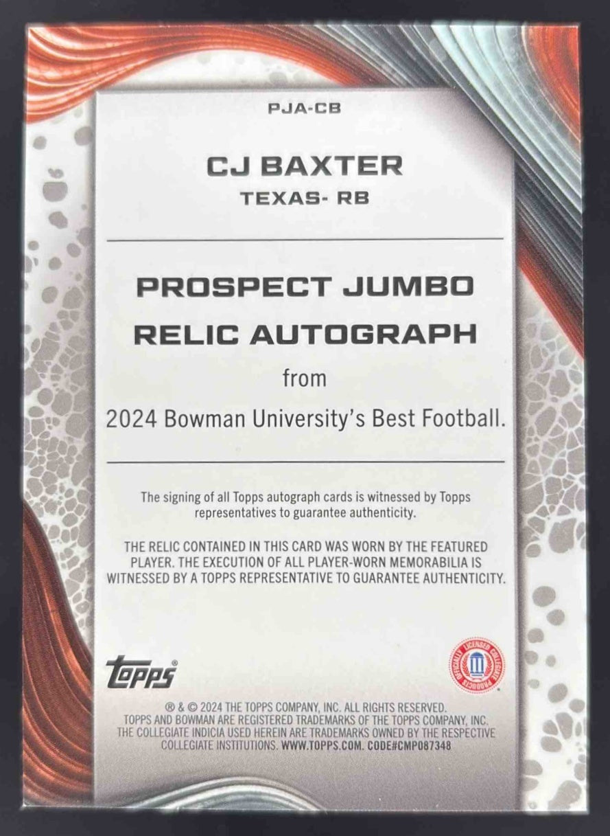2024 Bowman Best University Jumbo Relic Second Honor Roll #CB CJ Baxter Auto /99