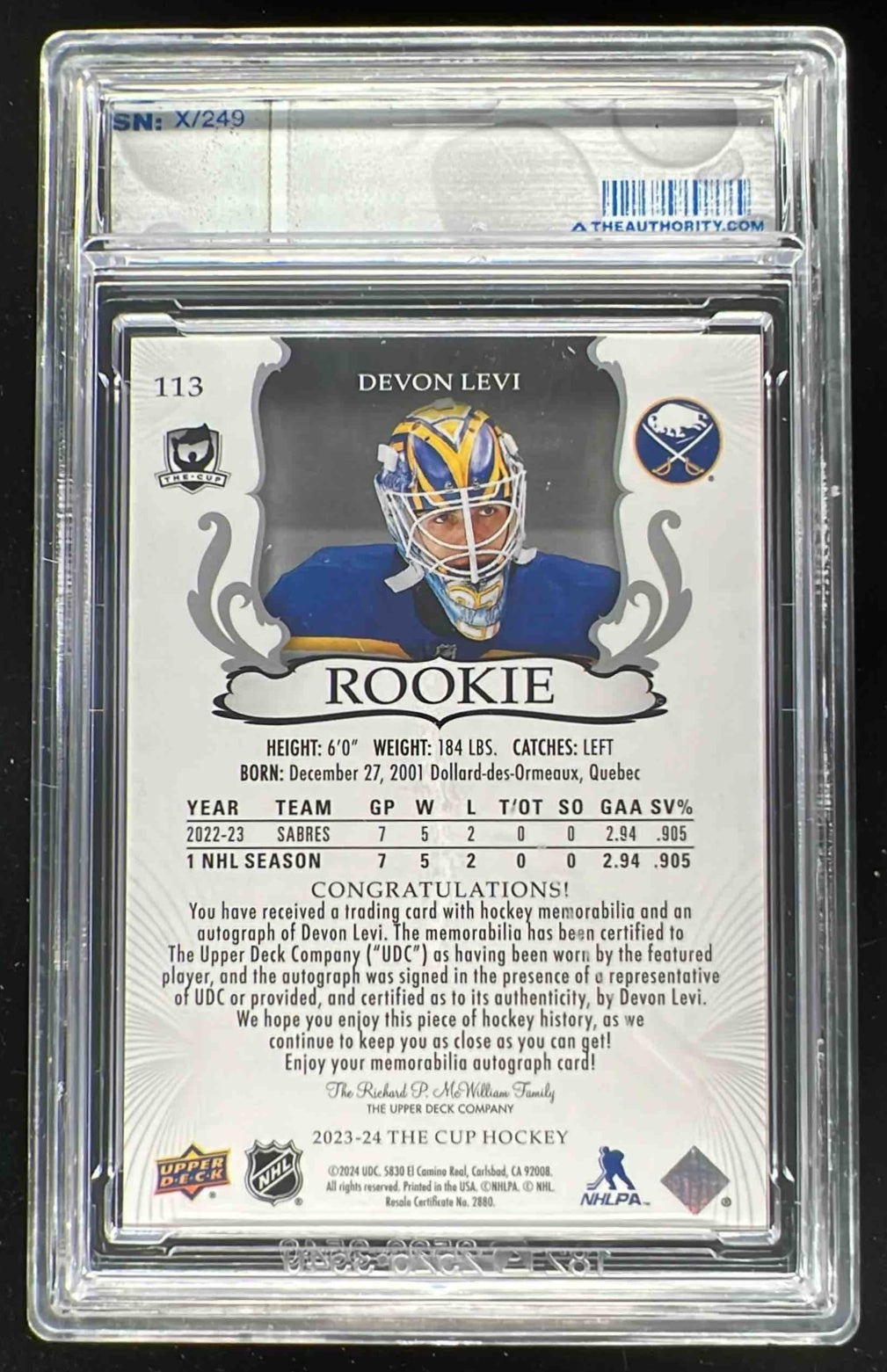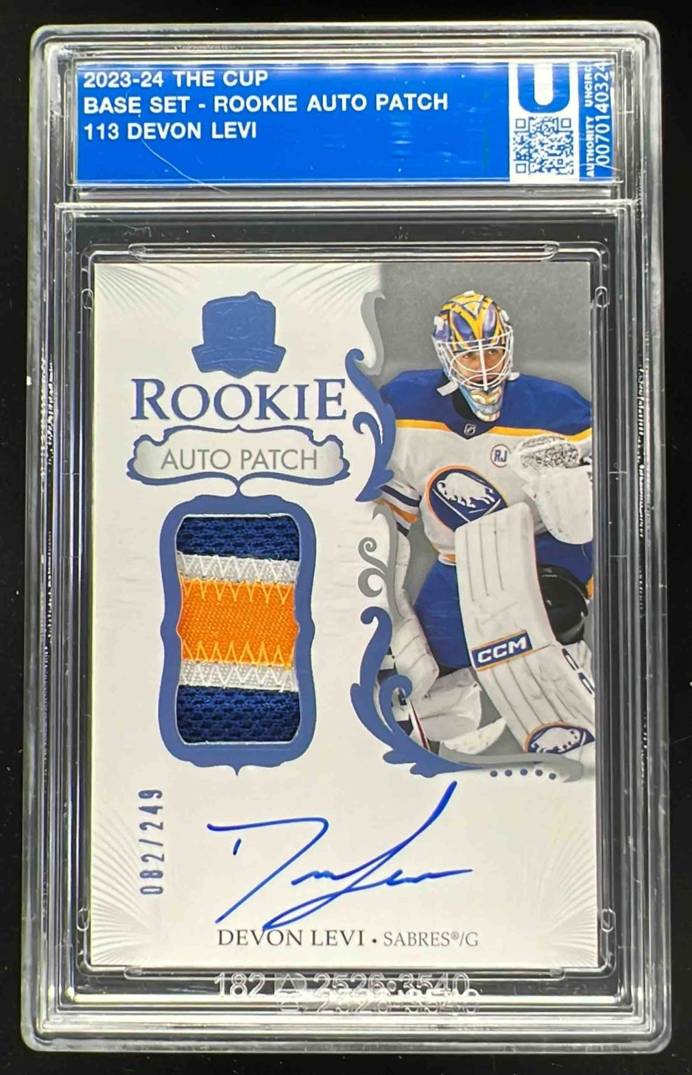 2023-24 The Cup #113 Devon Levi Rookie Patch Auto Autograph Auto /249