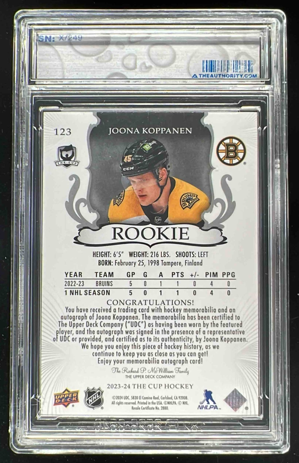 2023-24 The Cup #123 Joona Koppanen Rookie Patch Auto Autograph Auto /249