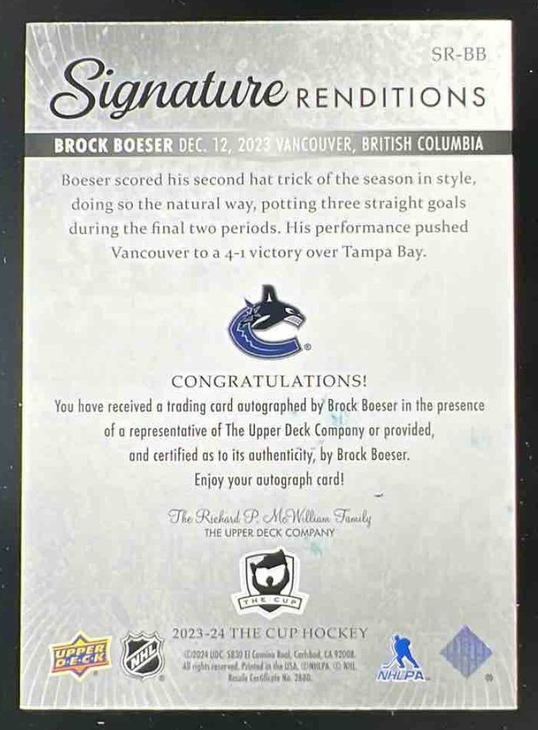 2023-24 The Cup Signature Renditions #SR-BB Brock Boeser Autograph Auto