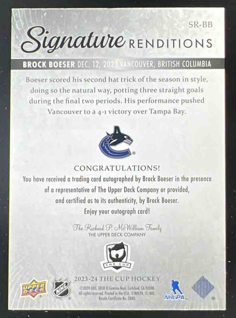 2023-24 The Cup Signature Renditions #SR-BB Brock Boeser Autograph Auto