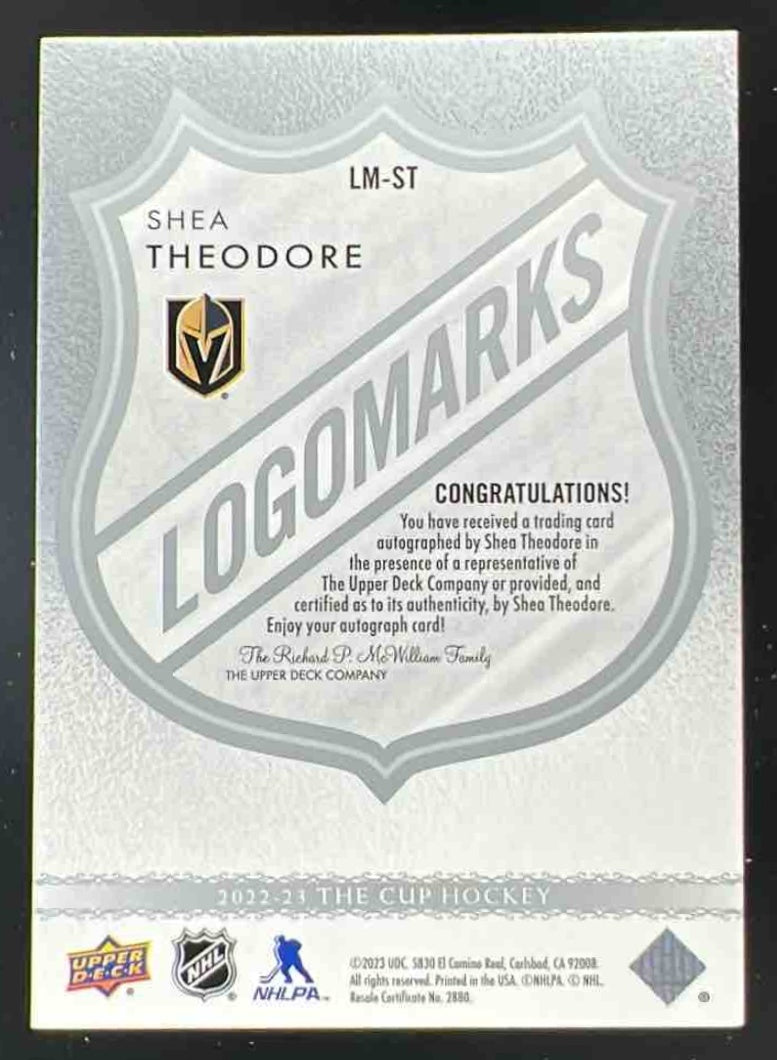 2022-23 Upper Deck The Cup LogoMarks #LM-ST Shea Theodore Auto