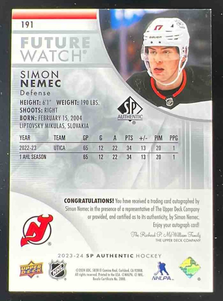 2023-24 SP Authentic #191 Simon Nemec Autograph RC Future Watch Auto /999