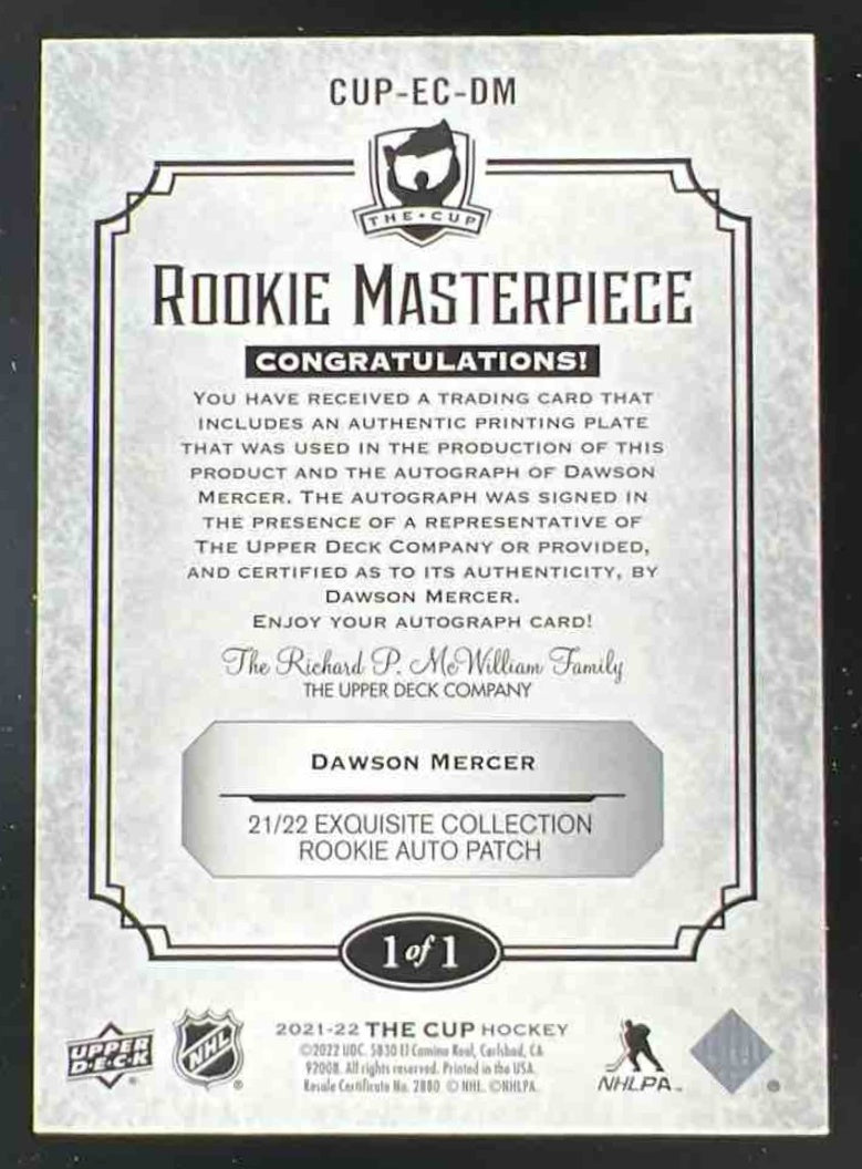 2021-22 The Cup Rookie Masterpiece Printing Plate Black Dawson Mercer 1/1