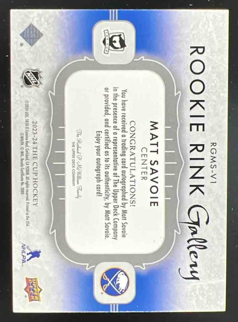 2023-24 The Cup Rookie Rink Gallery Auto #RGMS-V1 Matt Savoie Autograph Auto /25