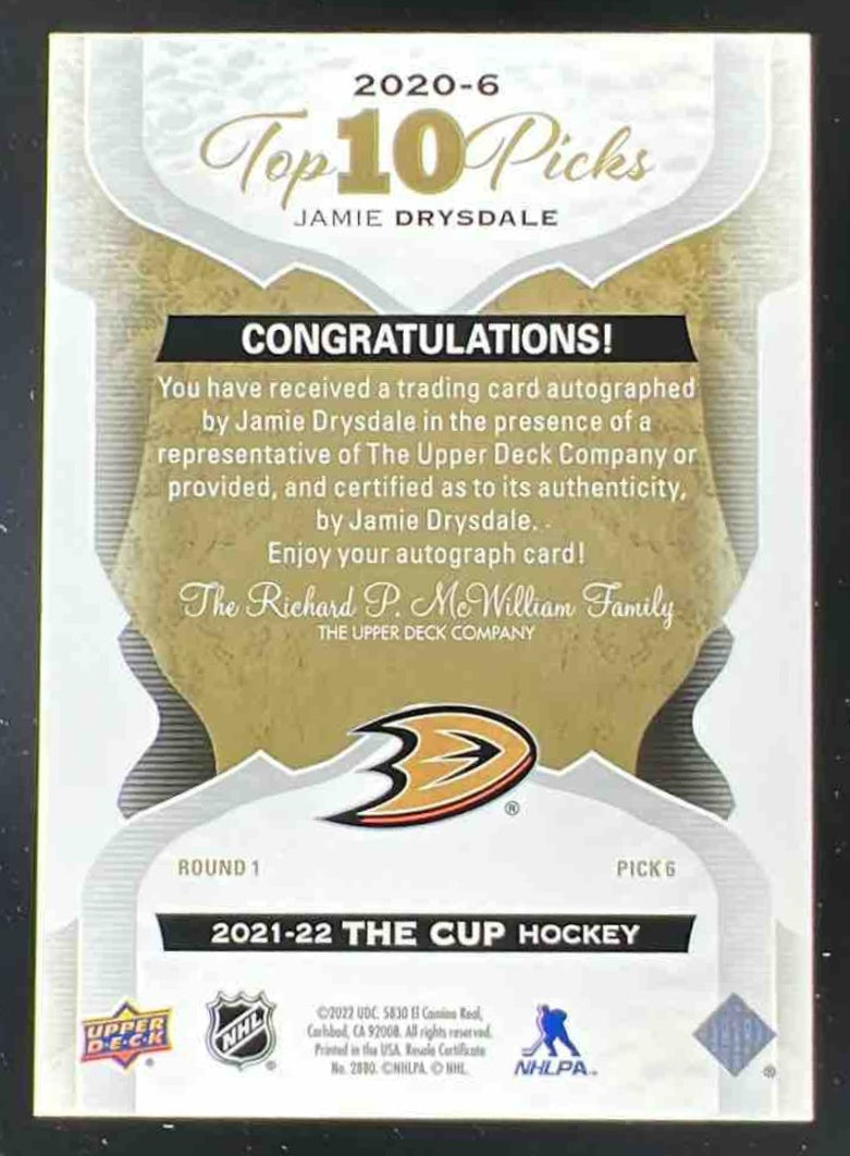 2021-22 The Cup Top 10 Picks Autograph #2020-6 Jamie Drysdale Auto /6