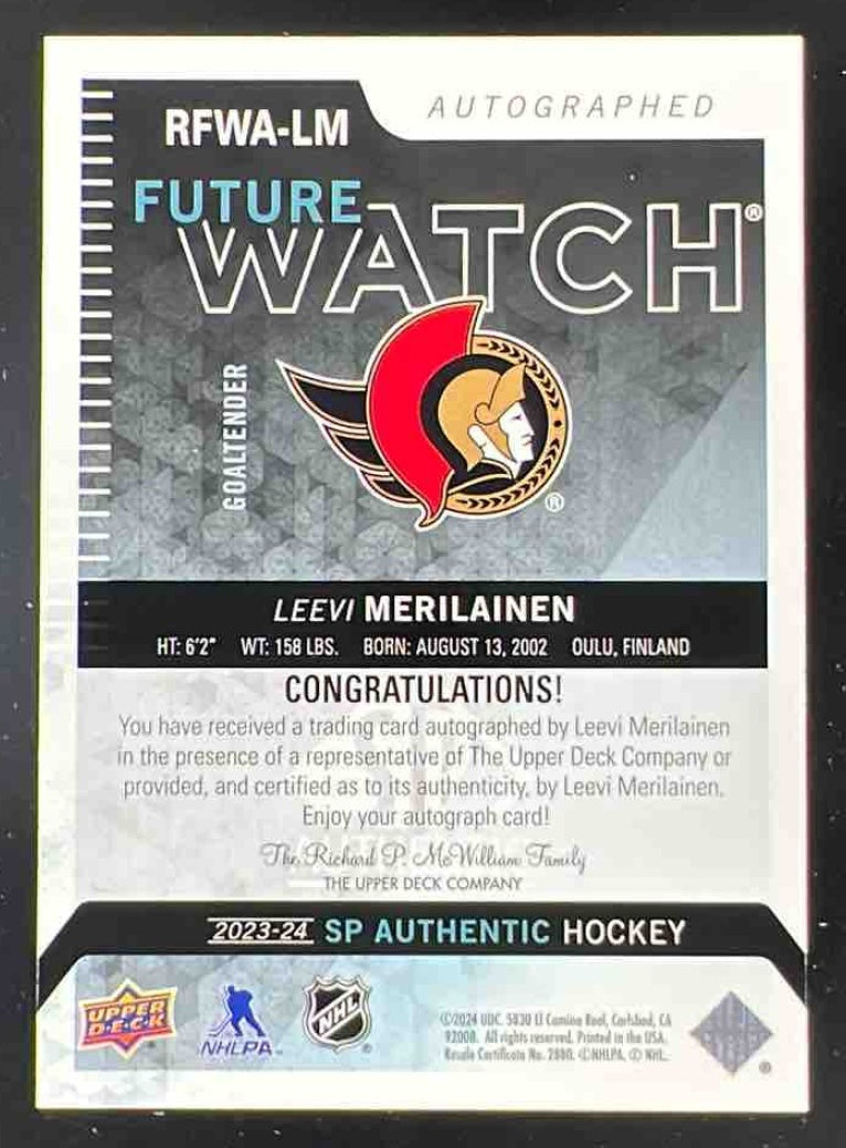 2023-24 SP Authentic Retro Future Watch #RFWA-LM Leevi Merilainen RC Auto /699