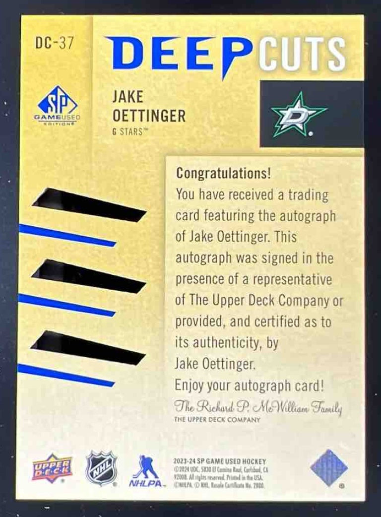2023-24 SP Game Used Deep Cuts Auto #DC-37 Jake Oettinger Autograph Auto /75