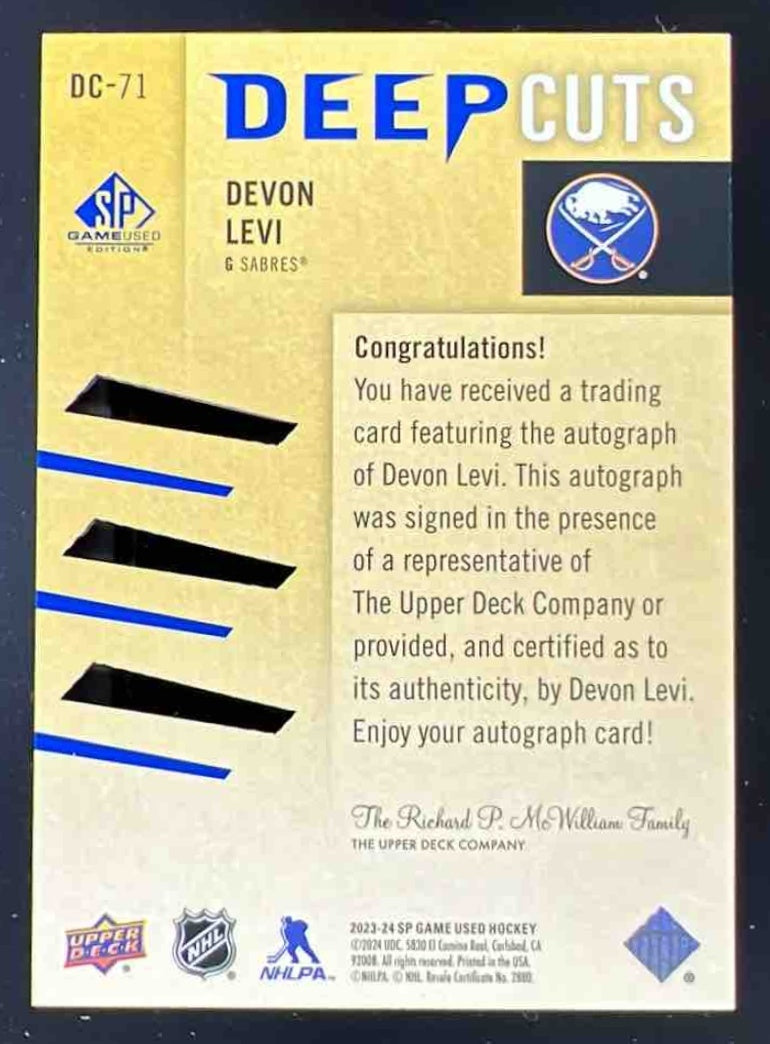 2023-24 SP Game Used Deep Cuts Auto #DC-71 Devon Levi Autograph RC Auto /75
