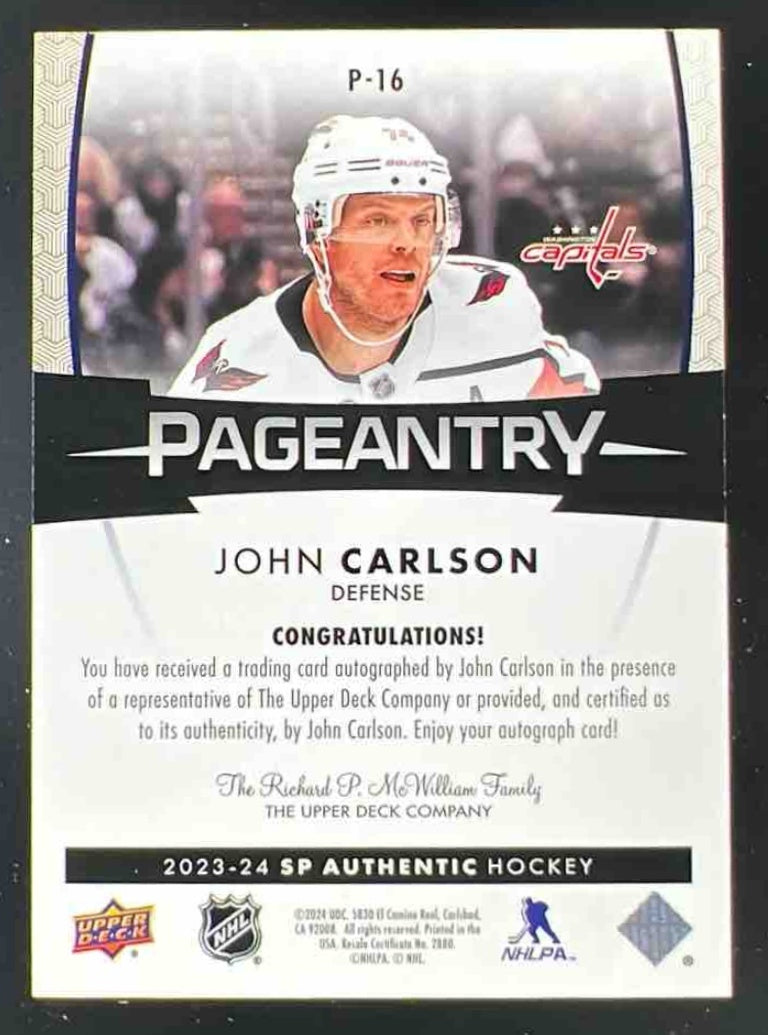 2023-24 SP Authentic Pageantry Autographs #P-16 John Carlson Autograph Auto