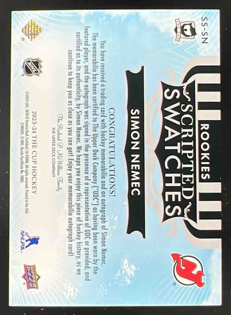 2023-24 The Cup Scripted Swatches #SS-SN Simon Nemec Autograph Auto /35