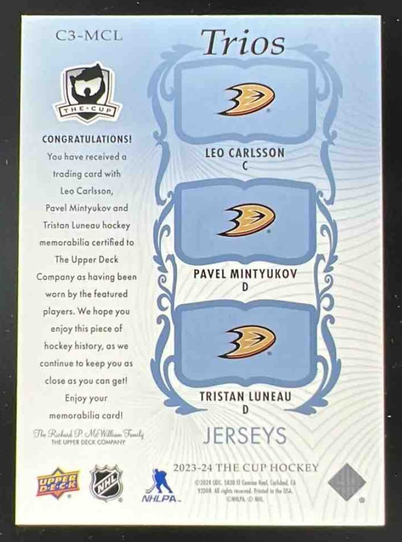 2023-24 The Cup Trios Jersey Leo Carlsson Pavel Mintyukov Tristan Luneau /35