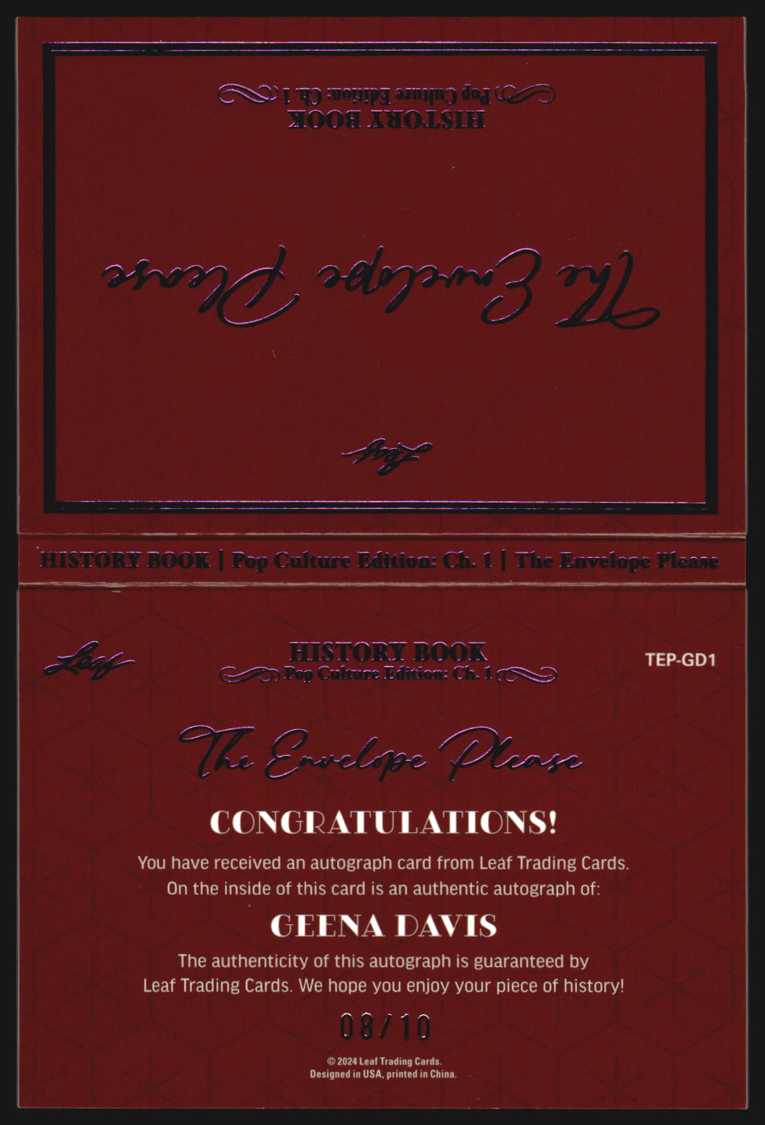 2024 Leaf History Book The Envelope Please Purple Autograph Geena Davis Auto /10