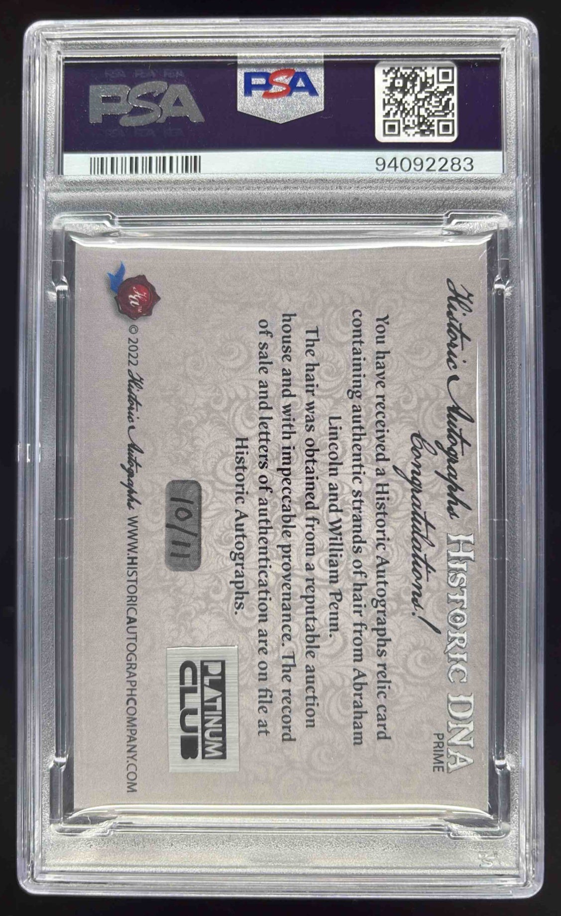 2023 Historic DNA Club Abraham Lincoln William Pen Hair Sample /11 PSA 8