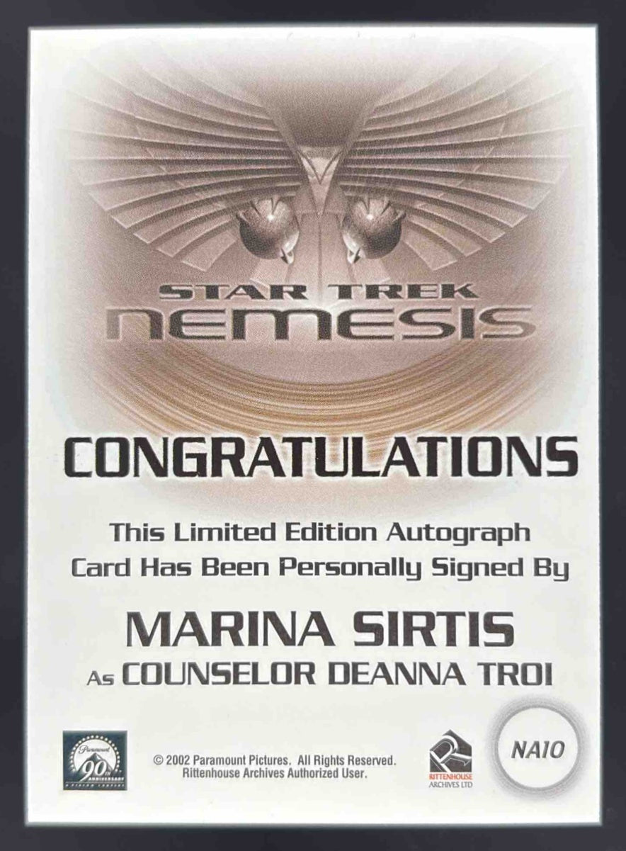 2002 Rittenhouse Star Trek: Nemesis Nemesis Autographs #NA10 Marina Sirtis Auto