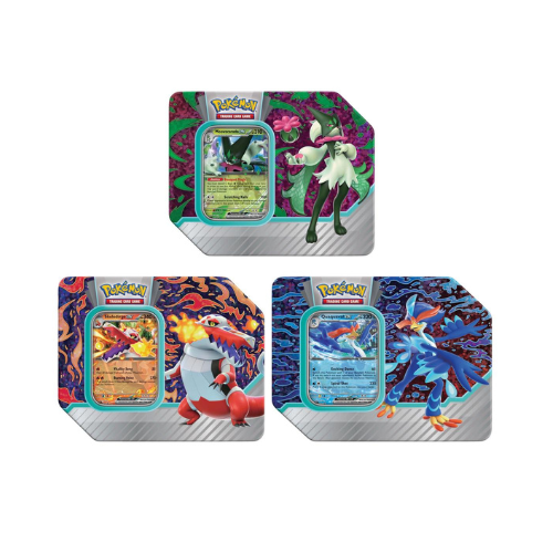 •  Choose the sneaky magic of Meowscarada ex, the fired-up singing of Skeledirge ex, or the dazzling dance moves of Quaquaval ex in the Pokémon TCG: Paldea Partners Tin.