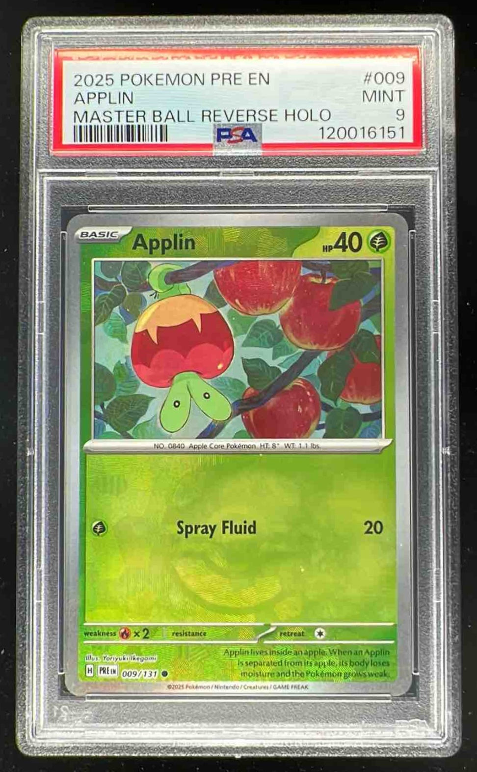 2025 Pokemon SV Prismatic Evolutions Reverse Holo Master Ball #009 Applin PSA 9