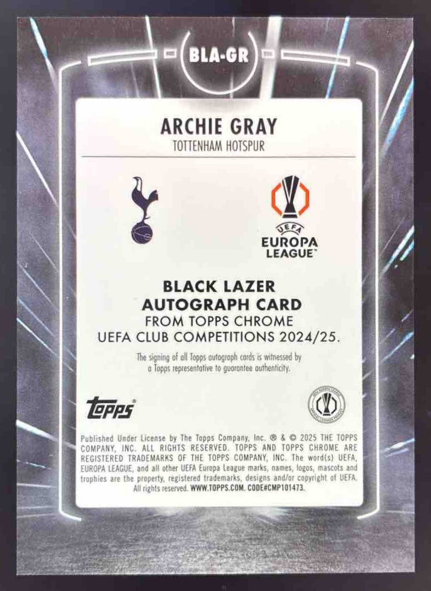 2024-25 Topps Chrome UEFA Black Lazer Autographs #BLA-GR Archie Gray Auto