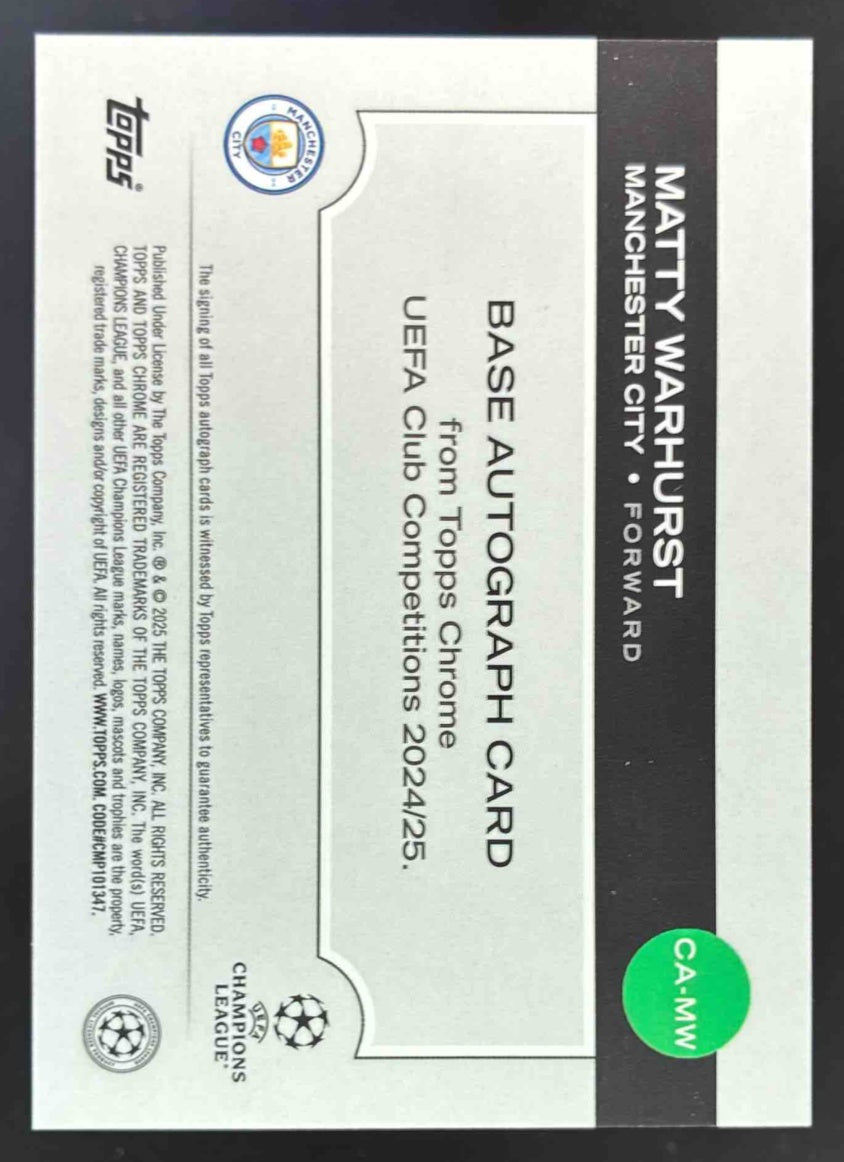 2024-25 Topps Chrome UEFA Autographs Gold Geometric Matty Warhurst RC Auto /50
