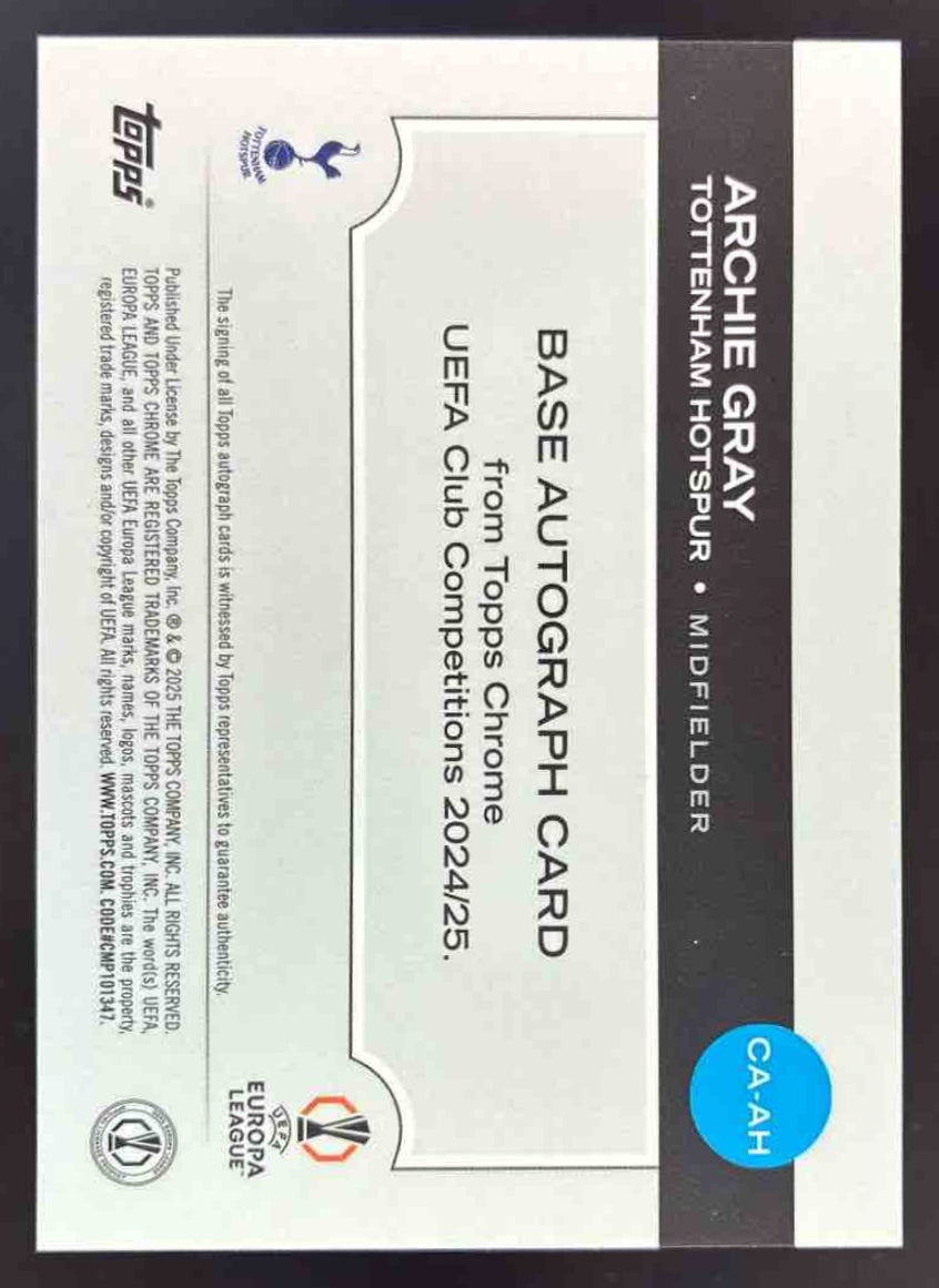 2024-25 Topps Chrome UEFA Autographs Blue Refractor #CA-AH Archie Gray Auto /150